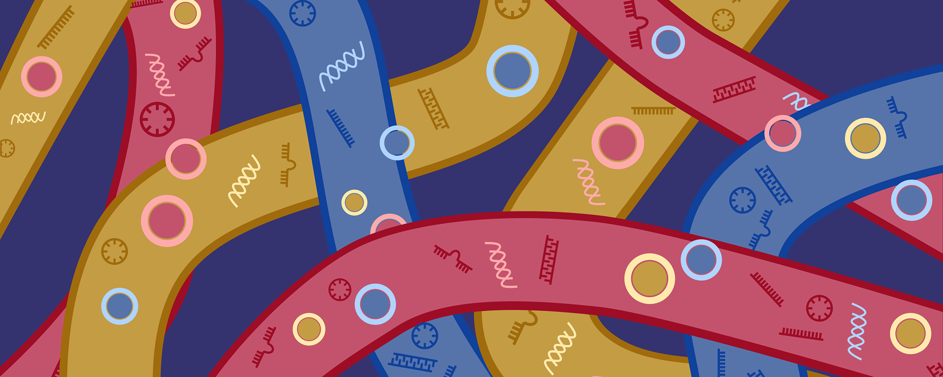 Draft cover for the Volume 6 of the Extracellular Vesicles and Circulating Nucleic Acids journal. The vector illustration represents the three main body fluids in a funky way.